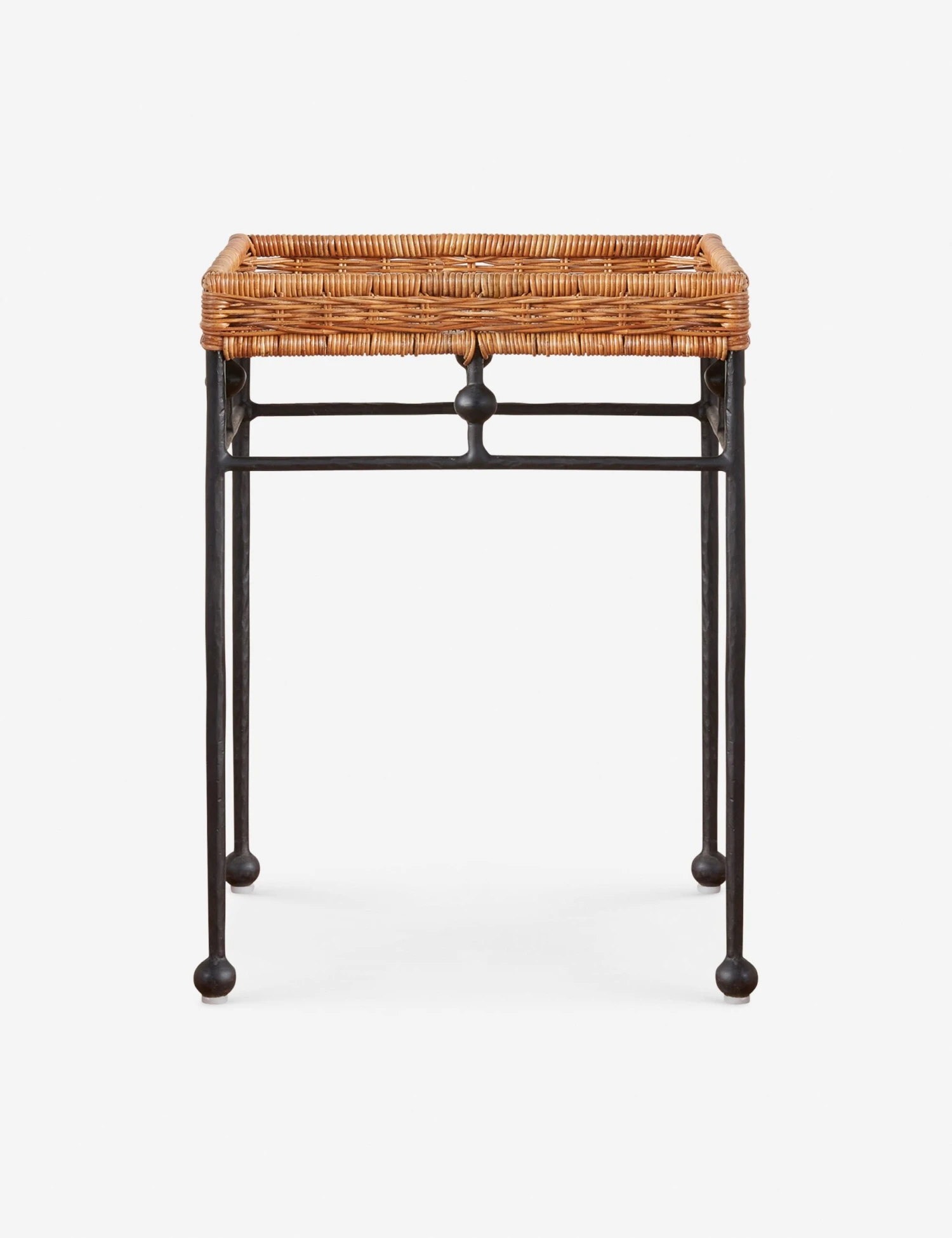 The Bonnet side table takes notes from the wickerwork Provence, blending rustic warmth with refined style. Its basket-style top offers the perfect perch for a book or drink. Crafted from sustainably sourced rattan on a hand-hammered wrought iron frame, this end table adds a touch of texture beside your seat, whether in a bright and airy pied-Ã -terre or covered patio lounge.