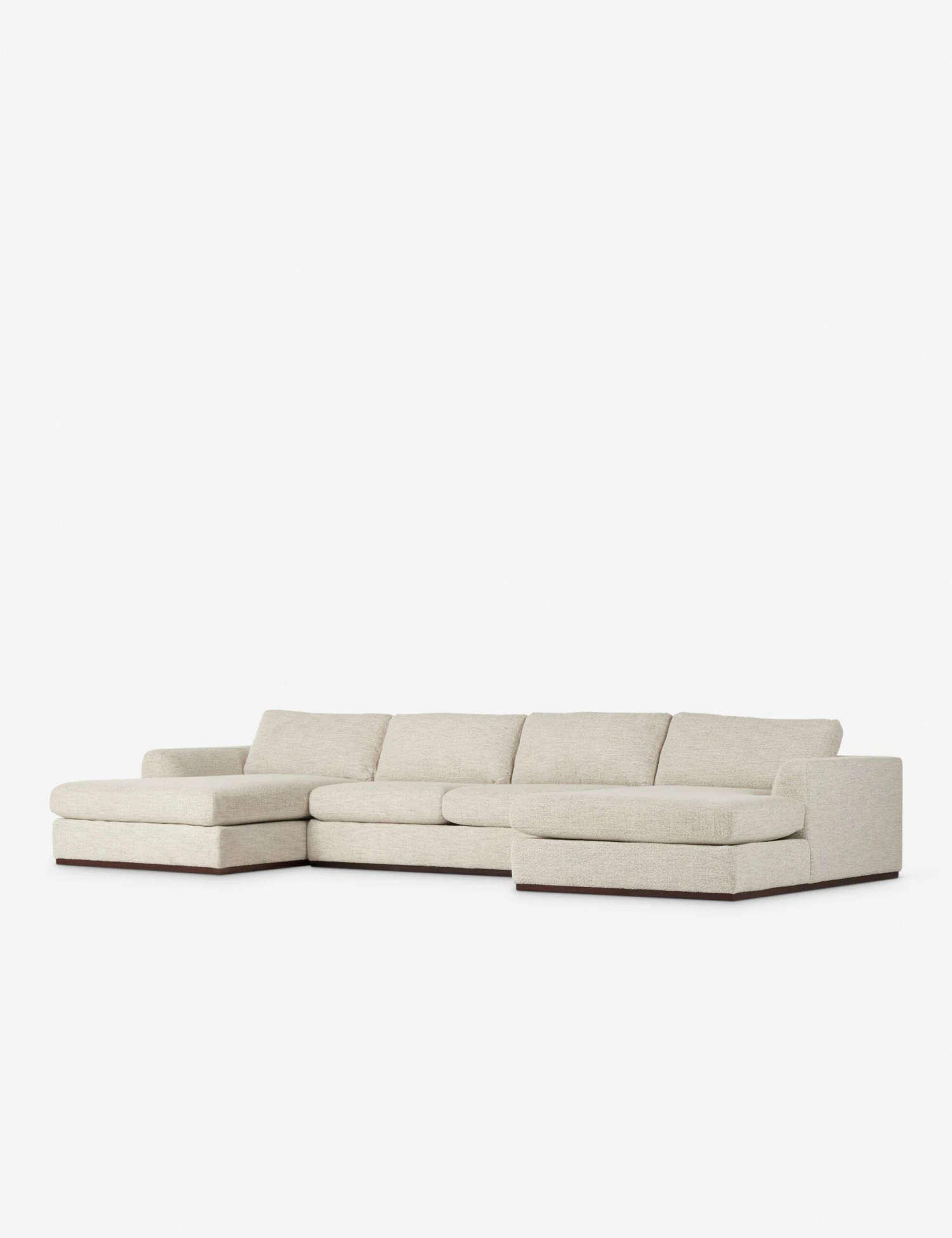 The Daniston sectional brings elegance to comfort with its clean, linear profile and loose back cushions. A wood plinth base and textural performance upholstery set off the design with an elevating touch while ensuring an easy-care anchor piece for everyday lounging.