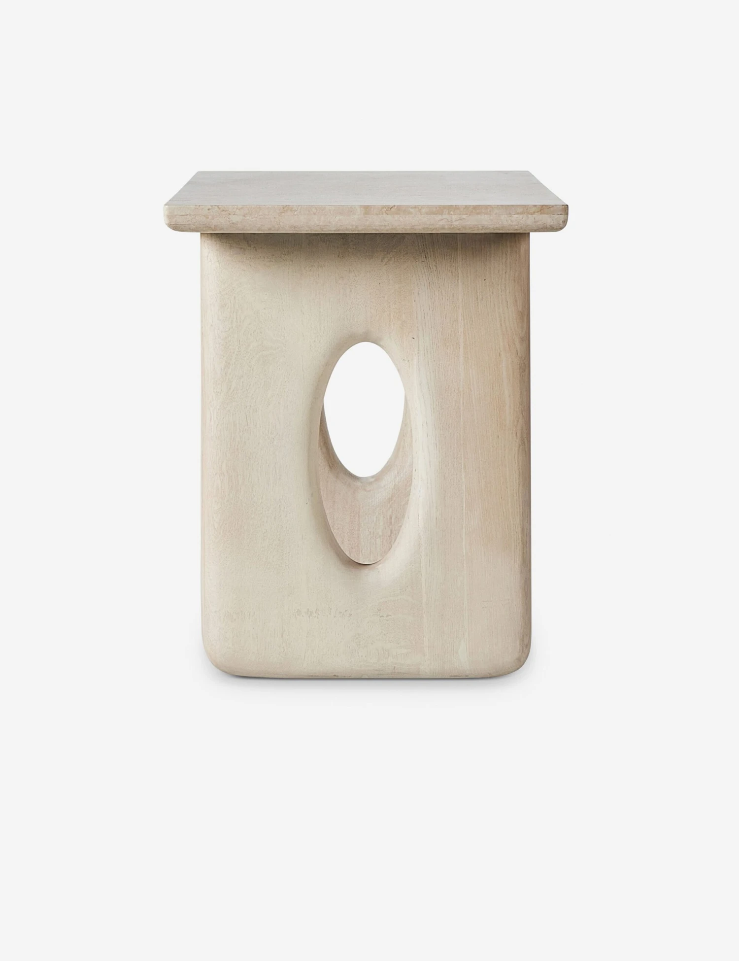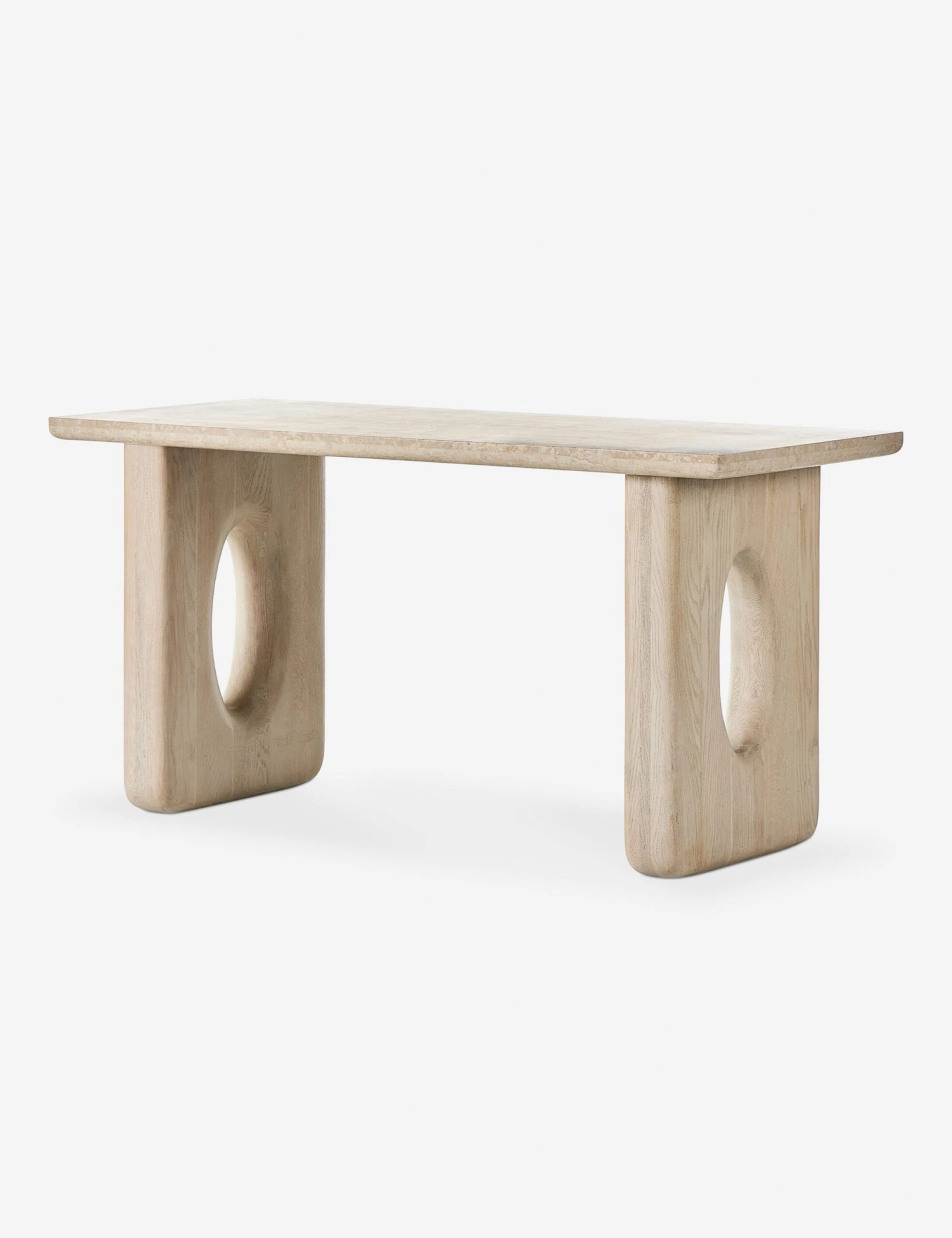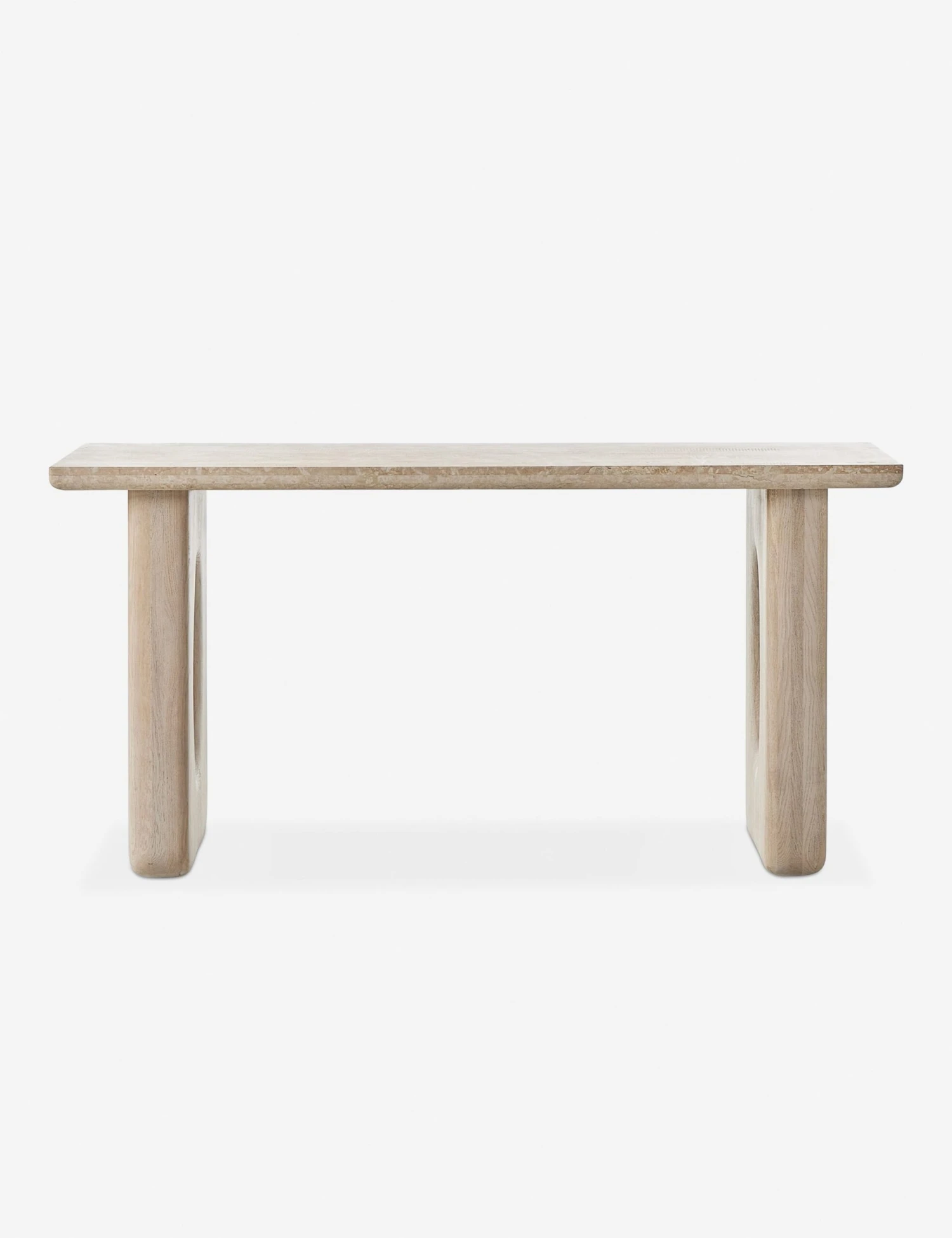 Cream marble and white oak create a monochromatic effect in this modern desk. Designed for stylish productivity, it features a wide top with a minimalist silhouette that includes two open block legs for a sturdy work surface. Rounded edges refine the piece, offering a soft ambiance perfect for a chic home office.