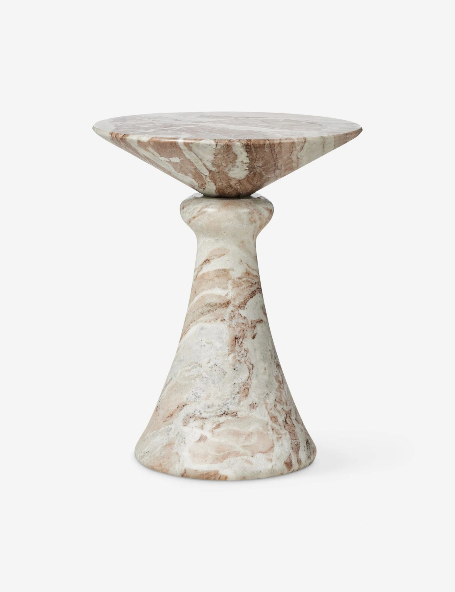 With its sculptural form and marble veining, this side table makes an artful statement. The smooth taper of the base and angular top create striking contrast, blending organic warmth with an architectural feel. Style it as an end table for a bold accent or use it as a pedestal to spotlight a favorite piece.