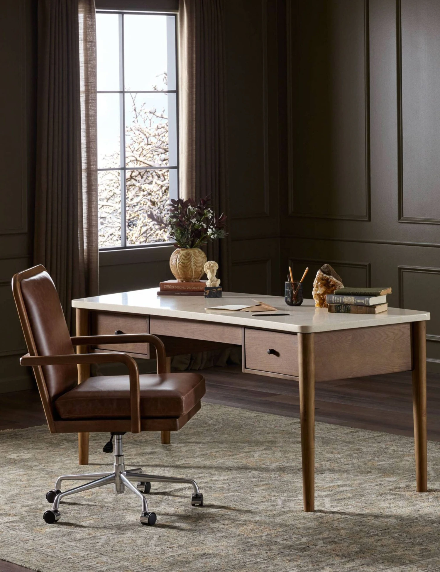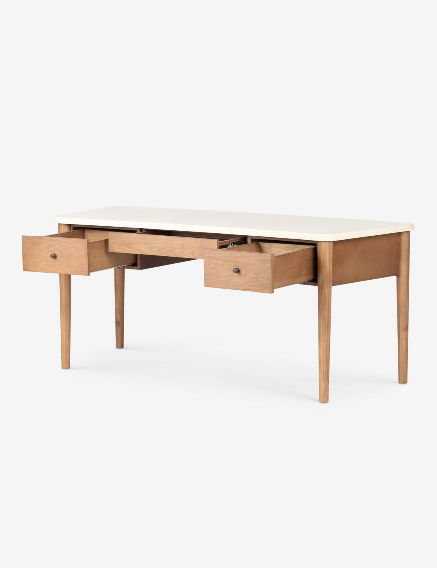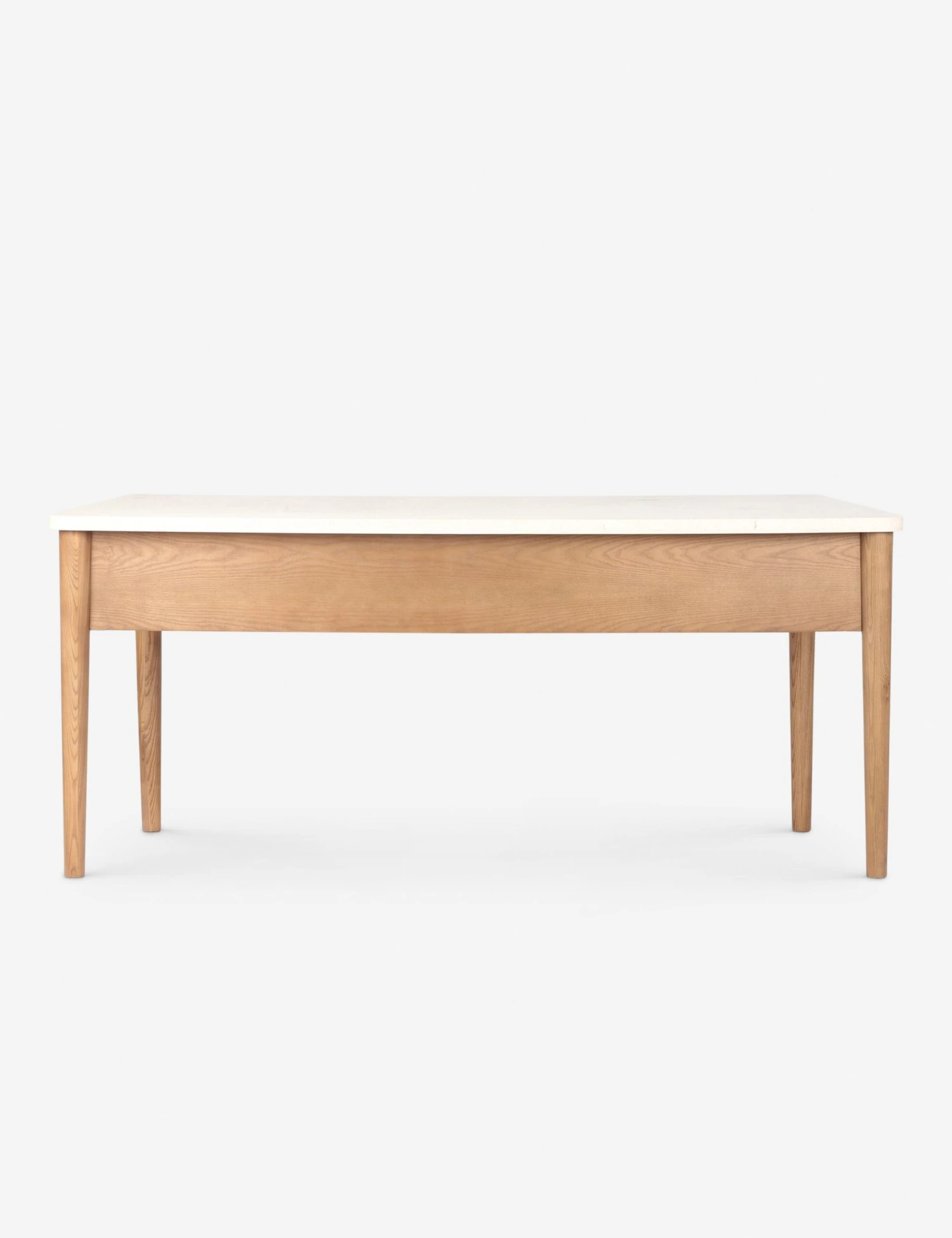 The Keegan desk sets a light tone for your workspace with its cream marble top and amber ash frame. The tapered legs and three drawers fashion an airy silhouette with a striking balance of function and form, perfect for a curated office or bedroom corner.
