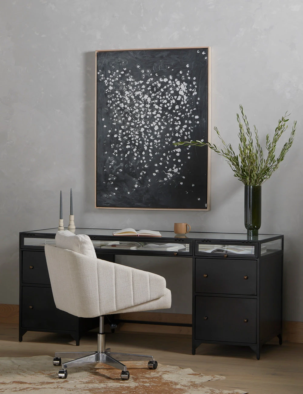 In a sleek nod to a shadow box design, this desk features an iron frame with glass enclosures for storage and display. The Malcom Executive Desk includes file drawers finished and brass knobs to offer a practical touch with an industrial edge.