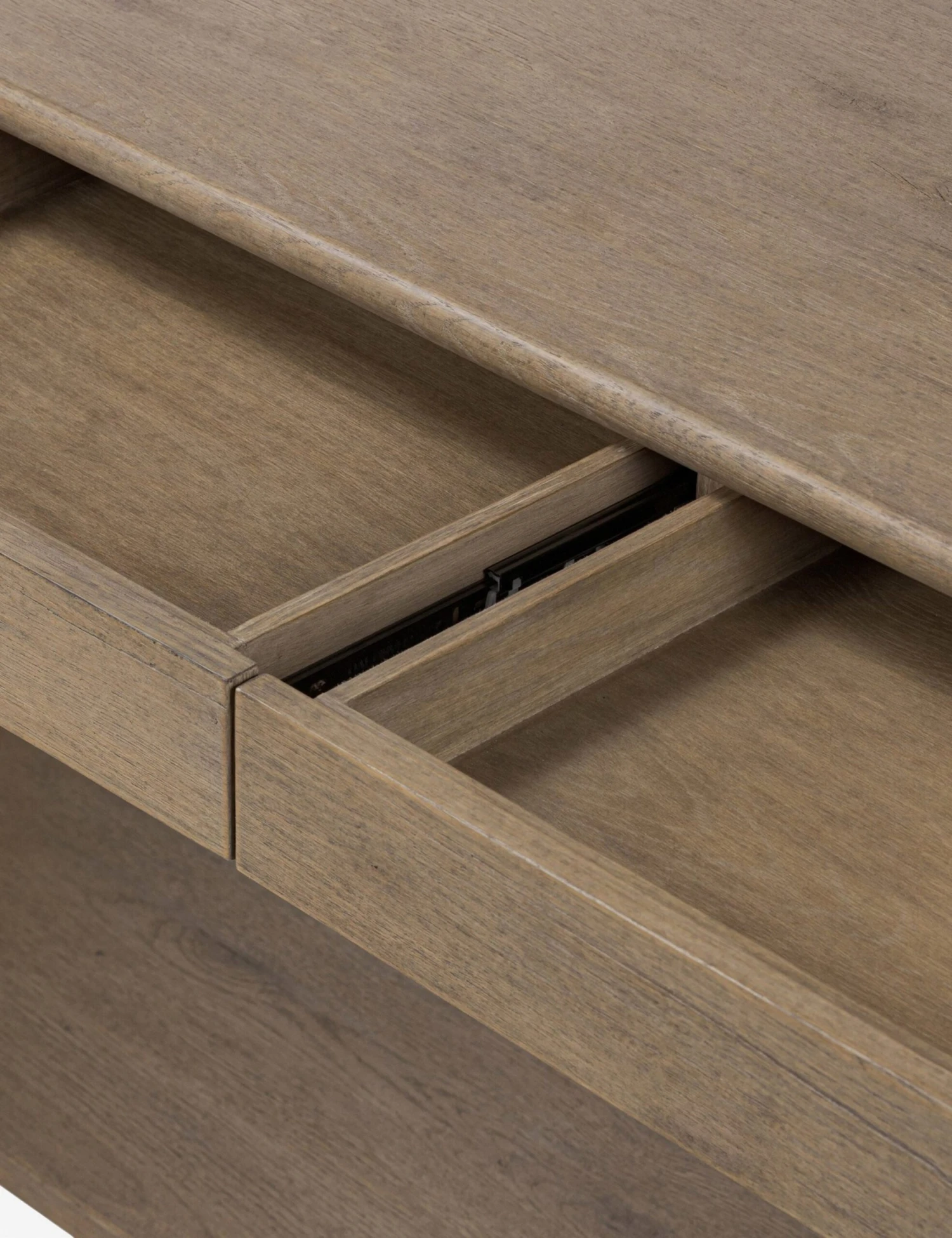 With softened lines and a grounded silhouette, the Soluna console table enriches a timeless form with subtle detail. The visible oak grain and bullnose edge lend a refined touch, bringing warmth and movement to its clean lines. Designed with slim drawers and a wide lower shelf, this modern console table brings the perfect touch of storage and surface space to an entryway, hallway, or living room.