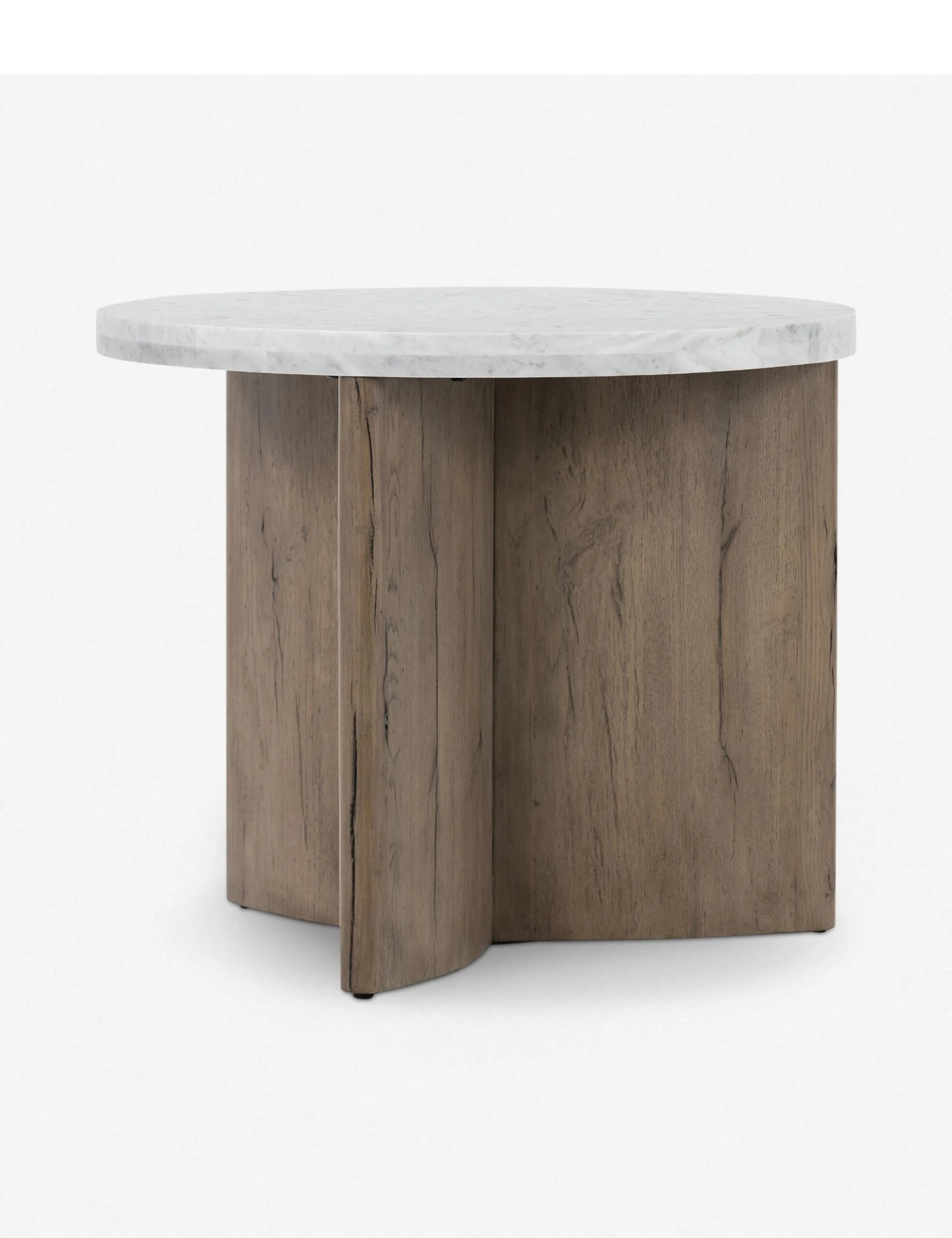 Mixed materials create a polished contrast in this luxe side table design. Thick-cut oak forms a sculptural base topped by a round white Italian marble tabletop with beautifully subtle striations. Finish your look with this end table for elevated everyday decor.